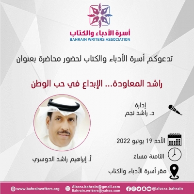 أقامت أسرة الأدباء والكتاب محاضرة بعنوان (راشد المعاودة… الإبداع في حب الوطن) تقديم الكاتب إبراهيم راشد الدوسري وإدارة الدكتور راشد نجم مساء الأحد 19 يونيو 2022