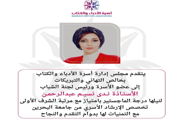 يتقدم مجلس إدارة أسرة الأدباء والكتاب بخالص التهاني والتبريكات إلى عضو الأسرة ورئيس لجنة الشباب الأستاذة ندى نسيم عبدالرحمن لنيلها درجة الماجستير بامتياز مع مرتبة الشرف الأولى تخصص "الإرشاد الأسري" من جامعة البحرين، مع التمنيات لها بدوام التقدم والنجاح. ..